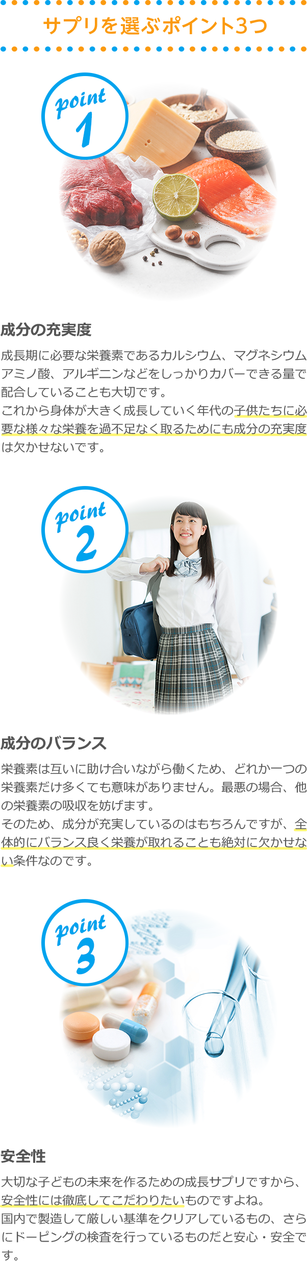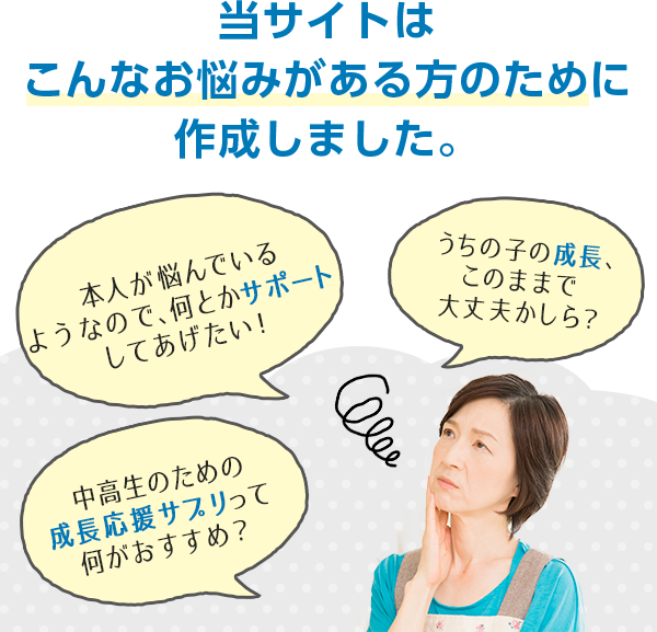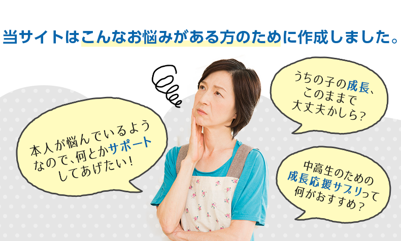 当サイトでは中高生のための成長サポートサプリの選び方から、オススメ商品、ピックアップ商品を部門別に比較など、中高生の成長を応援するための情報を厳選して紹介しています。